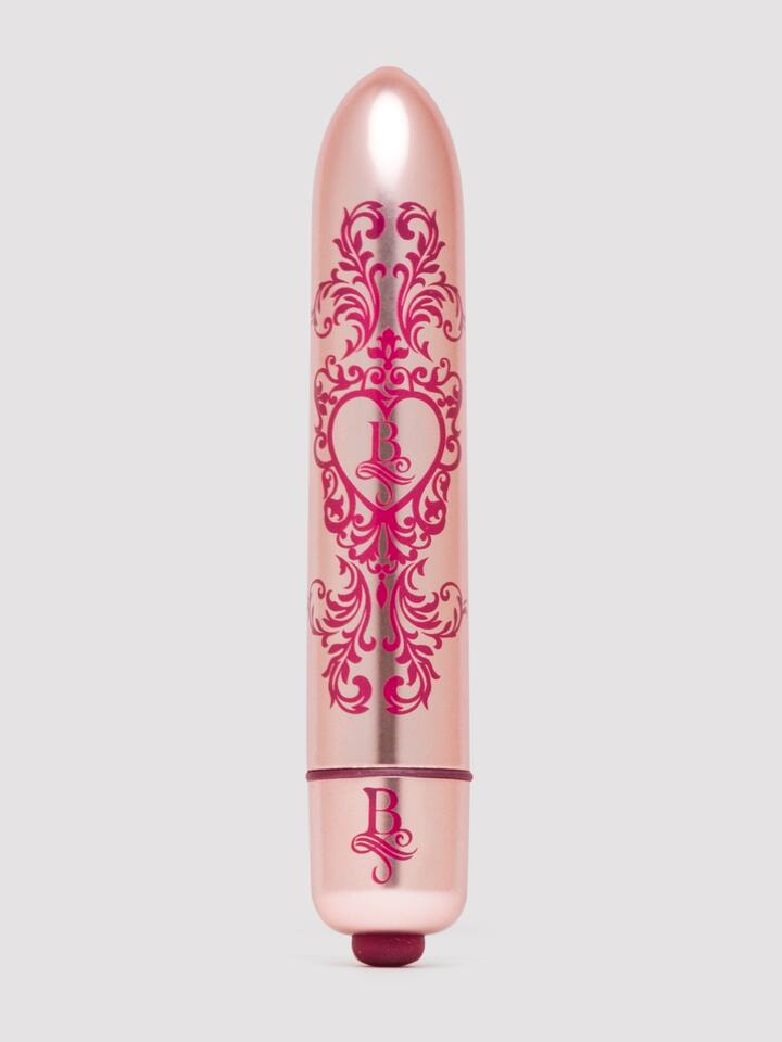 Enjoy precise and powerful external stimulation with the Promenade by Rocks Off, a mini bullet vibrator with a rounded end that applies soft pressure to your most sensitive spots like the clitoris, nipples or perineum. Carefully crafted from smooth, body-safe silicone and ABS plastic in a rose gold colourway with a red ornate pattern, this mini bullet vibe’s gentle, non-intimidating design and 3.5 inch size makes it a great choice for beginners, plus it’s super easy to clean. This mini marvel boasts 10 powerful vibration settings that can be easily controlled via the one-button interface. Press it once for lower frequency, high sensitivity rumbles, or press repeatedly to find the right mode for you. 100% waterproof for fun in the bath and shower, this toy also requires 1 x AAA battery (included) for up to 3 hours and 30 minutes of uninterrupted pleasure. For the best experience, use with a generous amount of water-based lubricant. Remove the batteries and clean thoroughly after use with warm water and mild soap, or sex toy cleaner. Please note: For external use only. Not for internal or anal use.
