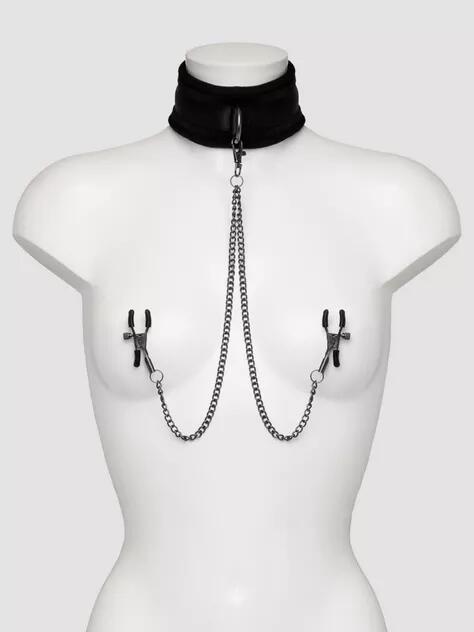 Indulge in perfect pinches and build up the sexual excitement with this elegant Sei Mio Twin Tweaks Collar and Nipple Clamps Set. This beautifully crafted collar is made from black velvet-soft faux leather and rests comfortably around the neck to set the stage for playful restraint play. The collar comes with one D-ring and two small O-rings for exploring versatile play options and Velcro straps for a secure fit. The silver metal chain links the collar to the silicone-tipped nipple clamps with a quick-release clip for adjusting intensity and easy removal. Perfect for those looking to explore new levels of BDSM, you can even unclip the clamps from the collar and use them independently to switch up your bondage play. Materials: Faux leather, nickel-free metal, silicone.
