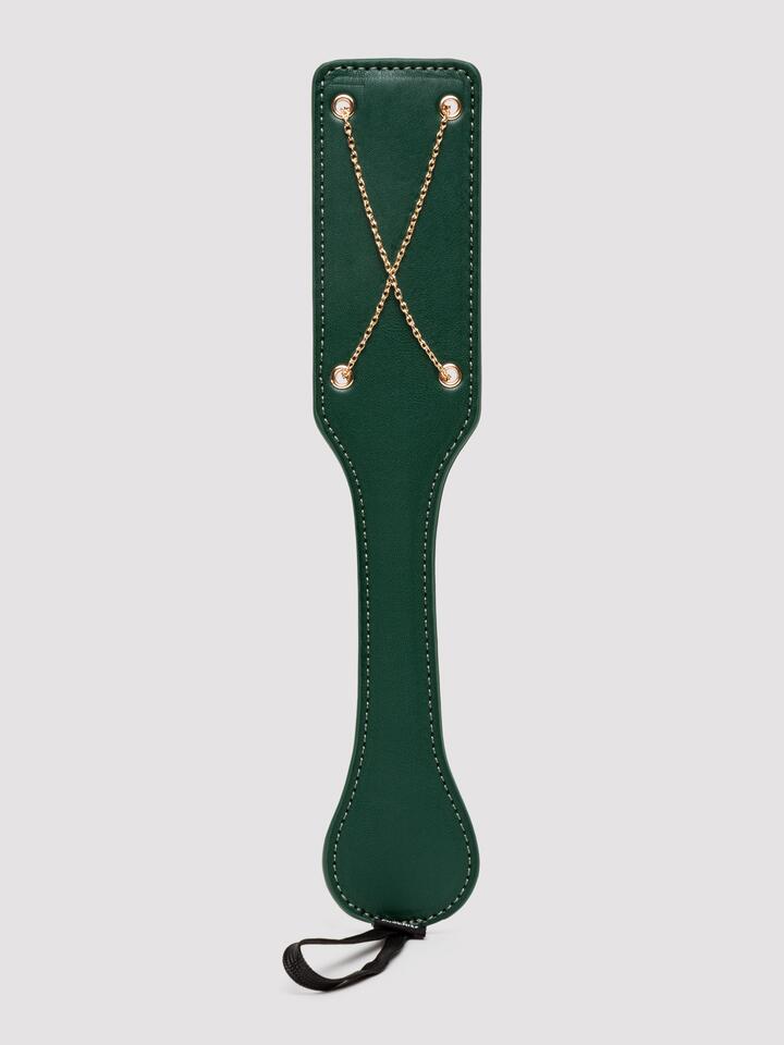 Teach your submissive a lesson with the Indica Chain Impressions Paddle from Sportsheets, featuring a luxurious gold-coloured chain embedded in emerald green faux leather that creates a striking texture that may leave a mark with each spank. Designed for satisfying thuds with just a touch of sting, this bold and beautiful paddle’s balanced design allows you to hold it comfortably with complete control during BDSM play. Materials: 75% Polyurethane, 20% Iron, 5% Polyester.