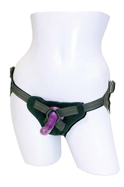The fully adjustable harness slips on easily and tightens until it feels snug and secure, fitting up to a 60-inch waist. Once youve got it on, just slide the included 4-inch dildo into the O-ring and tighten the straps to lock everything in place.