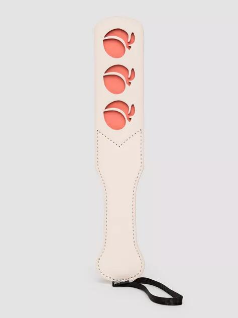 Add a playful, fruity twist to your spanks with this Peaches ‘n Crea Me Peach Paddle. Petite yet powerful, this paddle is designed for a delightful mix of fun and saucy sensations. Made for BDSM lovers of all levels. Crafted with faux leather, this cute paddle boasts split tips for a satisfying smack, while the peachy cutouts add a touch of whimsy with every swat at your partner’s peach. Perfectly sized for a teasing tap or a firmer spank, this peachy paddle is the ultimate accessory for a silly and flirty impact scene. Pair with a blindfold for even more intensity. Materials: 54% Polyurethane, 45% PVC, 1% Steel.
