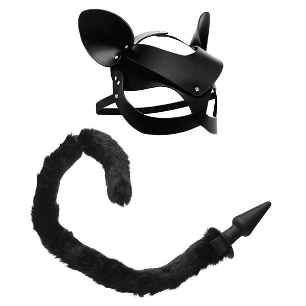 Transform your intimate evenings with the Tailz Black Cat Tail Anal Plug & Mask Set. This exciting set introduces playful kitty-themed exploration to your bedroom adventures. Your partner will feel irresistibly sexy in the stunning leather mask, embellished with rhinestones and perky ears, while the classic spade-shaped anal plug ensures a delightful experience. The soft, furry black tail adds an extra flirty touch, and with its two handy loops, you can easily add your own bullet vibrators for even more pleasure.